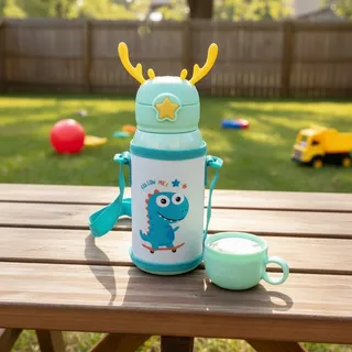 BOTELLA TERMICA INFANTIL RENO 500ML. De acero inoxidable recubierto, doble pico y taza. Ideal para la colonia y vacaciones. Sumalo a tu catalogo.